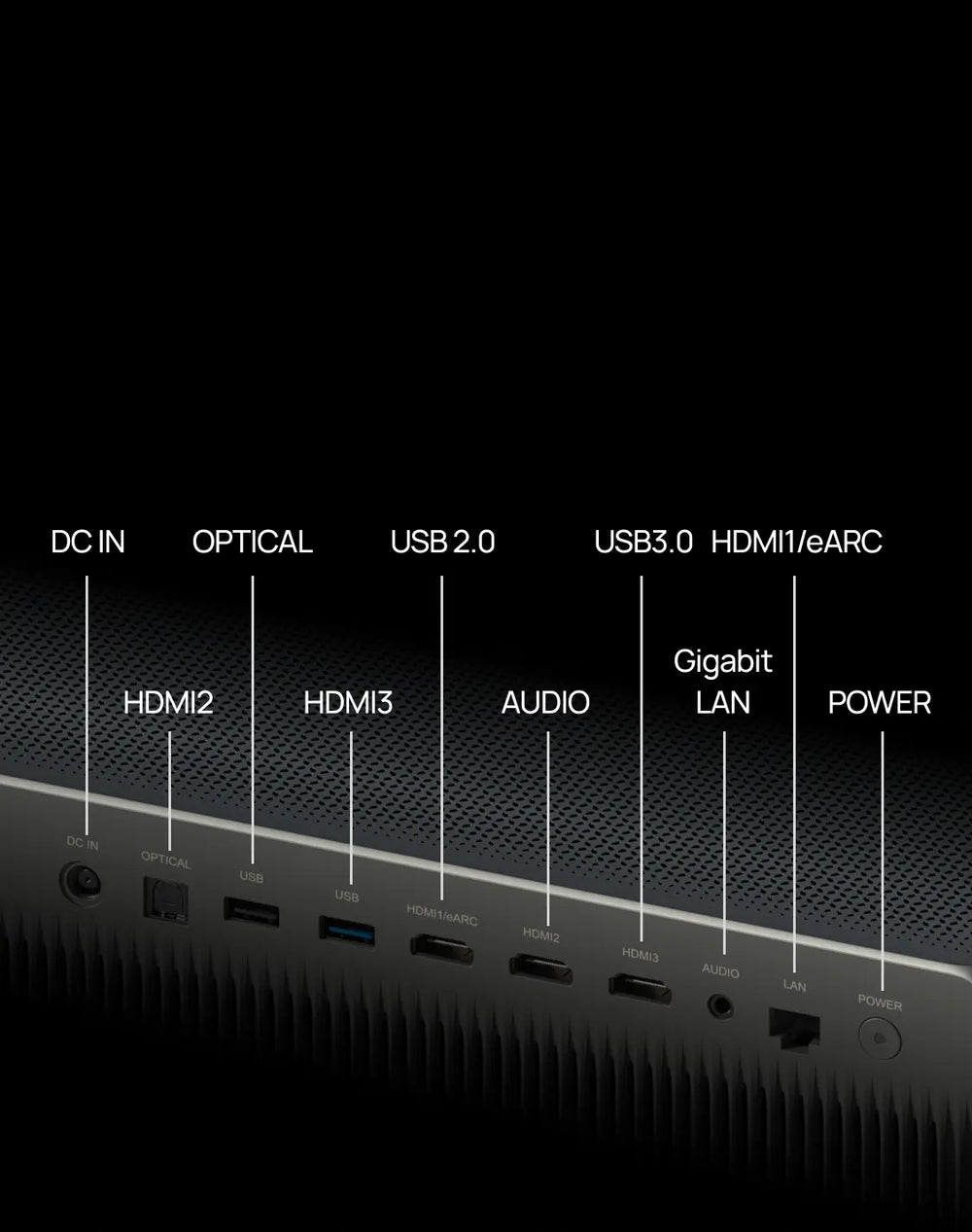 DC*1, HDMI x 3 (HDMI1 supports eARC), USB 2.0*1, USB 3.0*1, Gigabit LAN x1, Optical*1, Audio*1
