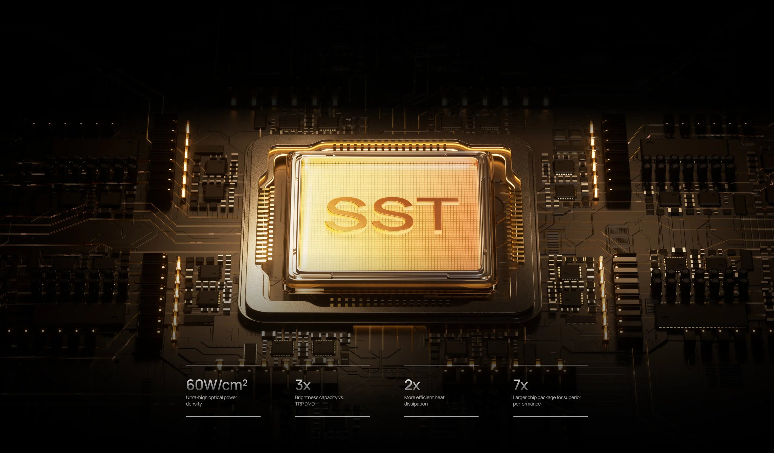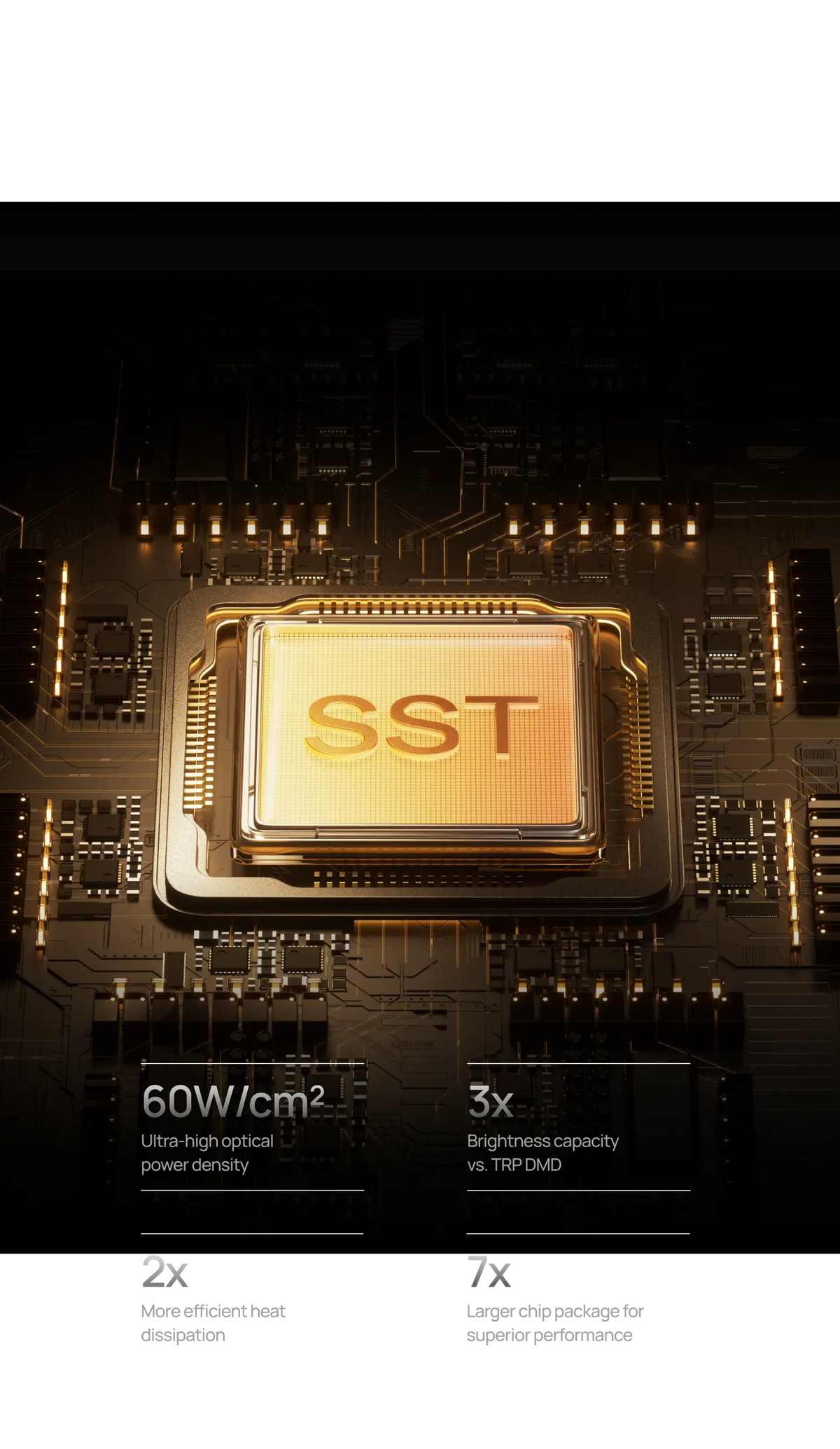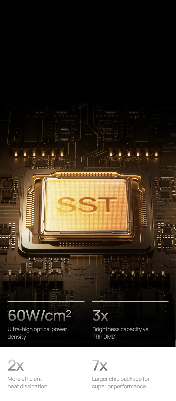The new SST DMD chip from Texas Instruments has been designed for higher power tolerance and improved thermal flow, allowing consistent brightness and image stability during extended viewing periods.