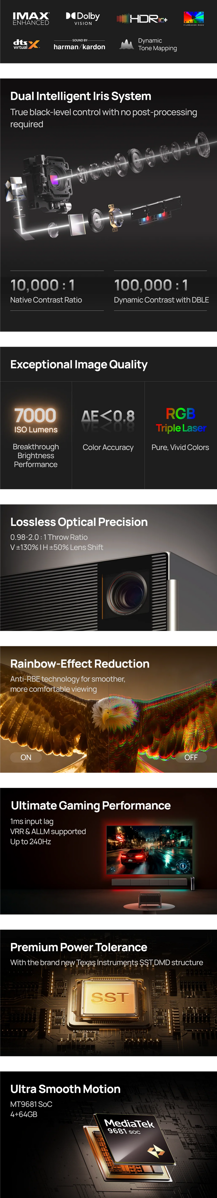 A 50-laser-chip RGB architecture delivers pure, vivid colors with exceptional brightness and contrast, achieving cinematic color accuracy and lifelike lighting across every scene.