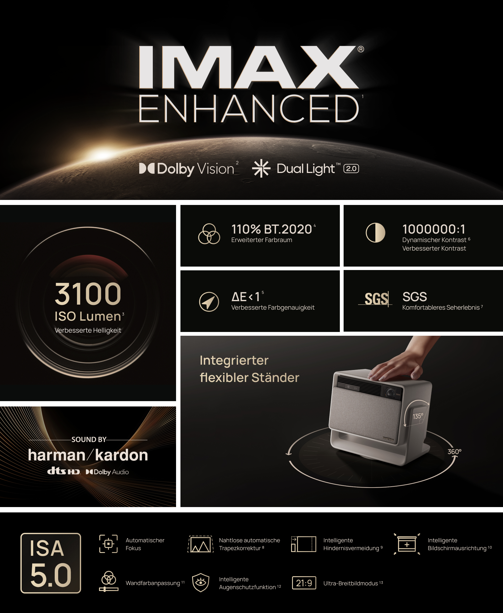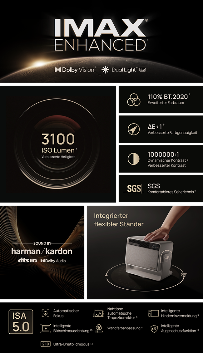 - IMAX Enhanced & Dolby Vision Zertifiziert: Mit IMAX Enhanced erleben Sie ein echtes IMAX-Kinoerlebnis auf einem beeindruckenden Großbildschirm. Dolby Vision sorgt für unglaublich lebendige Effekte und macht Ihr Seherlebnis noch immersiver.