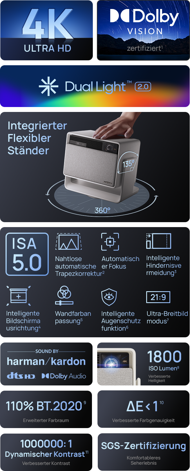 - Dual Light 2.0:Die branchenführende Lösung für mehr Helligkeit, präzisere Farben, bessere Bildqualität und ein verbessertes Seherlebnis. Mit 1800 ISO Lumen sorgt der Projektor für ein strahlend helles Bild, das weder durch Zeit noch durch Raum eingeschränkt ist, damit der große Bildschirm klar und hell bleibt.